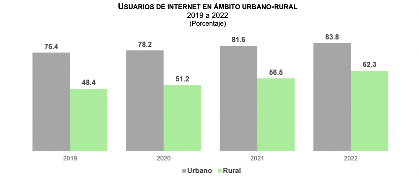 Con el paso de los años el servicio de Internet ha crecido en todo el país, sin embargo todavía existe una brecha digital notable entre zonas urbanas y rurales. Las poblaciones rurales y algunas comunidades indígenas aún enfrentan desafíos en cuanto a conectividad y acceso. A diferencia del ámbito urbano, donde el 83.8 % de la población usaba Internet en 2022, en lugares rurales solo el 62.3 % de las personas disponía de esta herramienta.