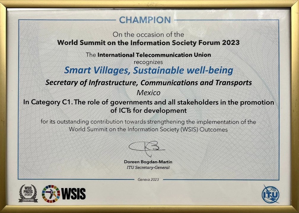 En 2023, el programa Aldeas Inteligentes, Bienestar Sostenible recibió el premio “Champion” en la categoría C1 “El rol de los gobiernos y todas las partes interesadas en la promoción de las TIC para el desarrollo”, otorgado en la Cumbre Mundial de la Sociedad de la Información y el Conocimiento (CMSI) (WSIS, por sus siglas en inglés), organizada por la UIT.