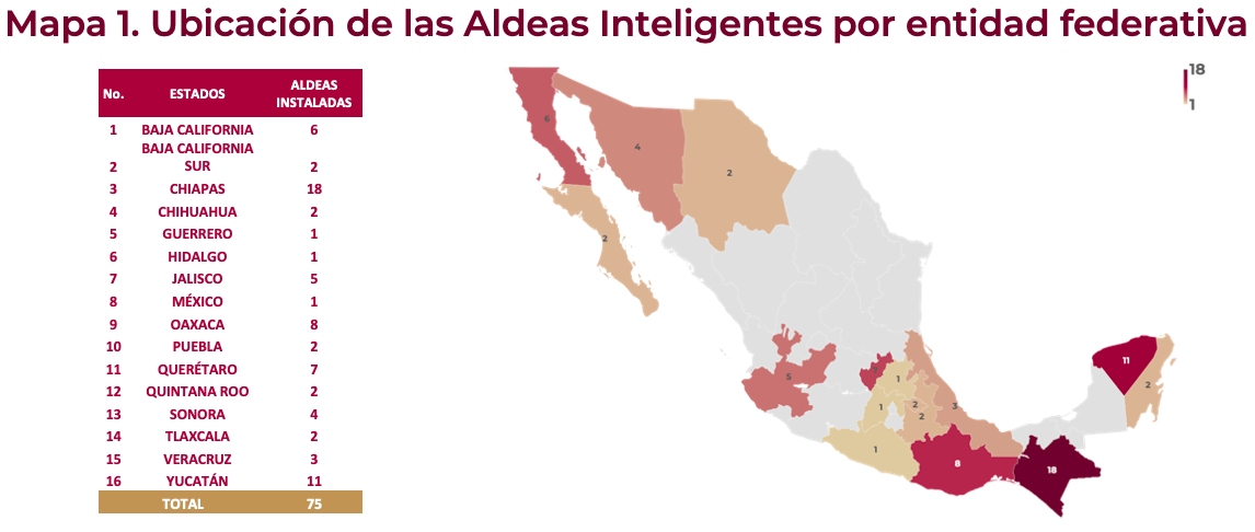 A un año de terminar el sexenio, ya han sido instaladas las 75 Aldeas Inteligentes contempladas en este proyecto. Con ello se ha impactado positivamente en ámbitos como educación, salud, turismo y desarrollo económico sostenible en las zonas más alejadas de 16 estados de la República Mexicana; entre los que destacan Chiapas y Yucatán, con 18 y 11 Aldeas Inteligentes instaladas respectivamente.