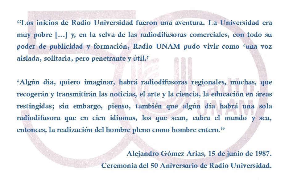 El objetivo de Radio Universidad consistió entonces en “apartarse en su programación y en sus fines de las grandes difusoras comerciales, crear un estilo nuevo y, por supuesto, no abandonar el propósito principal de toda institución educativa, que es el de difundir la cultura. En nuestro proyecto [enfatizaba Gómez Arias] figuraba también la música nacional y el folklor, pero todo eso era una idea en cierto modo depurada y alejada de lo que las difusoras comerciales hacían. Creo que de alguna manera lo logramos, si no plenamente, sí como un inicio, como una simiente.”9