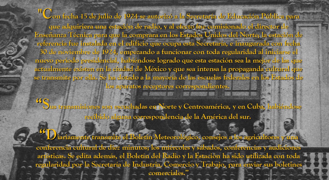 Si bien, en México la Secretaría de Comunicaciones y Obras Públicas había estipulado desde octubre de 1923, los tipos de estaciones, sus contenidos y requisitos para obtener permisos, las contadas radioemisoras que entonces funcionaban eran de carácter experimental y las pocas dedicadas a la divulgación nutrían sus cortas emisiones (una hora de duración) con conciertos de música, conferencias científicas y literarias, lectura de poesía y piezas de teatro.1