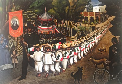 La posrevolución recuperó a los héroes independentistas que sembraron las raíces del progreso en México. La obra, Desfile cívico escolar, plasmó el espíritu libertario y revolucionario de las nuevas generaciones.