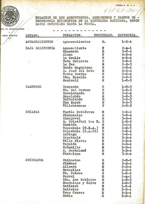 Lo más importante del documento encontrado en el Archivo de Concentración es la relación que muestra un listado de aeropuertos, aeródromos y campos de emergencia existentes en la República a mediados de 1939. Se tenía entonces un total de 267 instalaciones aeroportuarias de las cuales seis eran propiedad federal: México, Distrito Federal; Islas Marías, Nayarit; Ciudad Victoria, Tamaulipas; San Andrés Tuxtla y Coatzacoalcos en Veracruz; y Zacoalco, Jalisco; 26 pertenecían a la Secretaría de la Defensa Nacional, 190 eran municipales y 45 particulares (entre los cuales se hallaba la Compañía Mexicana de Aviación).