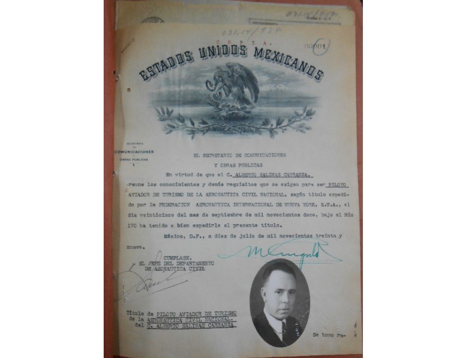 En este marco histórico, el secretario de Comunicaciones otorgó el título de Piloto Aviador de Turismo de la Aeronáutica Civil Nacional al C. Alberto Salinas Carranza, expedido el 10 de junio de 1939. Sobrino directo de don Venustiano Carranza, Alberto nació también en la población de Cuatro Ciénegas en el estado de Coahuila el 15 de noviembre de 1892. Su familia, señalan sus biógrafos, se dedicaba al comercio y a la agricultura, actividades que la situaban en un nivel económico y social medio.