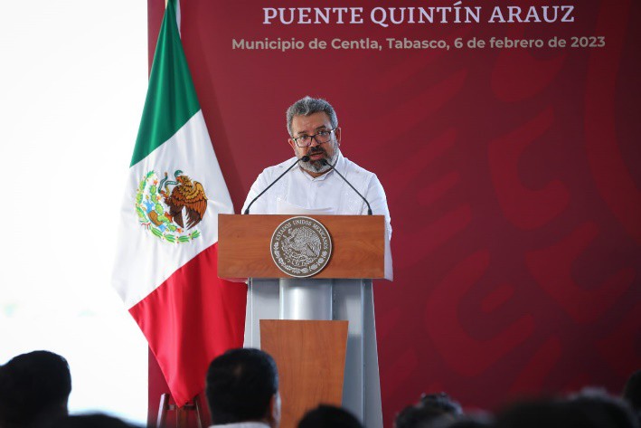Acompañado del secretario de Gobernación, del gobernador del estado de Tabasco y de la presidenta municipal de Centla, entre otras personalidades, el secretario Lic. Jorge Nuño Lara enfatizó en el discurso de inauguración (6 de febrero, 2023) que esta obra hará posible que la comunidad de Quintín Arauz, una de las más aisladas de Tabasco, se comunique con las demás poblaciones del municipio y del estado entero.