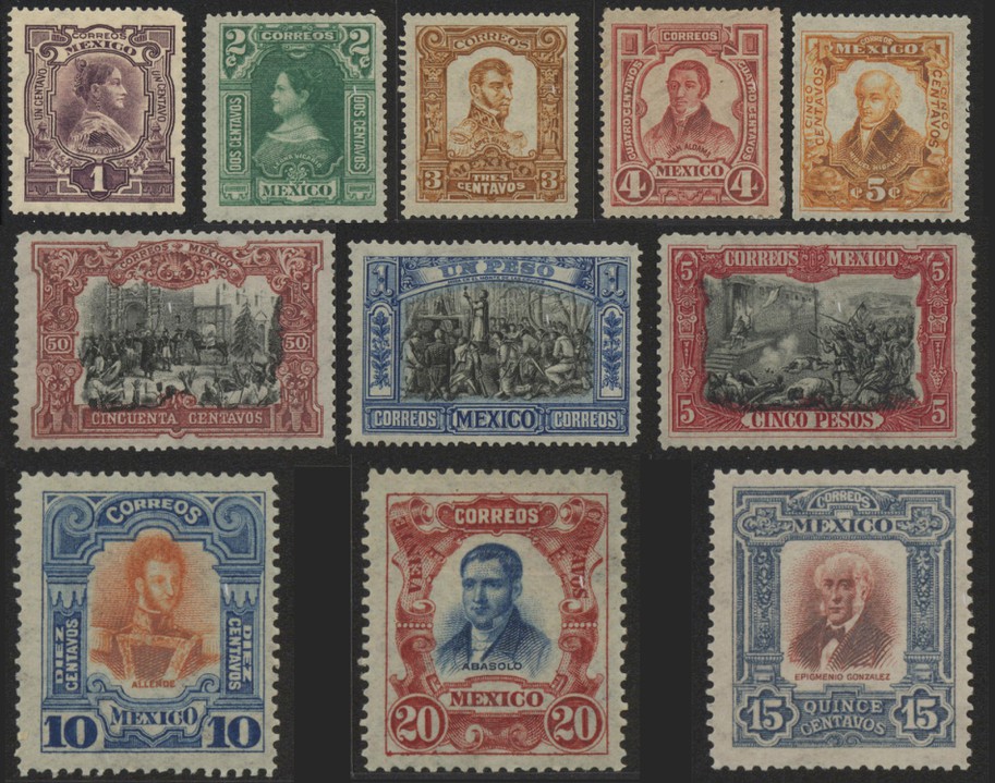 Por su parte, las estampillas de cinco pesos, tendrían la imagen de la heroica toma de Granaditas; las de un peso, la imponente ceremonia religiosa de la misa que ofreciera Hidalgo en el Monte de las Cruces antes de la memorable batalla; y las de cincuenta centavos, la alegoría del grito de Independencia en Dolores. Todas ellas empezaron a circular el 16 de septiembre de 1910 con un gran éxito.3