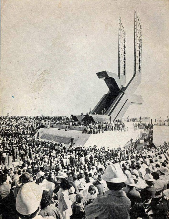 El 1 de diciembre de 1973 el presidente Luis Echeverría Álvarez, frente a una multitud reunida en el cruce de la Carretera Transpeninsular con el Paralelo 28, inauguró esta nueva vía que hacía posible comunicar a todos los bajacalifornianos del norte con los del sur y viceversa. Se develó entonces un llamativo monumento de 36 metros de altura en forma de águila estilizada cuyas alas cobijan o enlazan a las dos Californias unidas por la patria. La obra escultórica (que hoy forma parte de las instalaciones del 21 Regimiento de Caballería Motorizado) fue diseñada por los arquitectos Edmundo Rodríguez Saldívar y Ángel Negrete González, quienes ganaron cien mil pesos como premio y la dirección del conjunto que incluía -además del monumento- la plaza ceremonial y un albergue parador.[9]