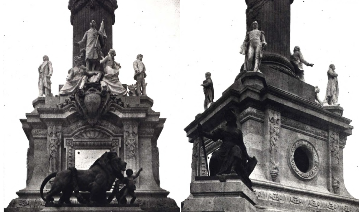 9 El ingeniero Rivas Mercado precisó que la estatuaria de la Columna de la Independencia fue modelada por el escultor Enrique Alciati, profesor de la Escuela Nacional de Bellas Artes y que las estatuas en mármol habían sido desbastadas en Carrara y, concluidas en el país; en tanto que, las estatuas en bronce habían sido fundidas en Florencia, de acuerdo con los diseños enviados desde México. Finalmente, los modelos para los ornatos fueron ejecutados en París, y terminaron de ser tallados en piedra, en México, por el ornamentista Nezzy y Regazoni. En La Patria en el Paseo de la Reforma.