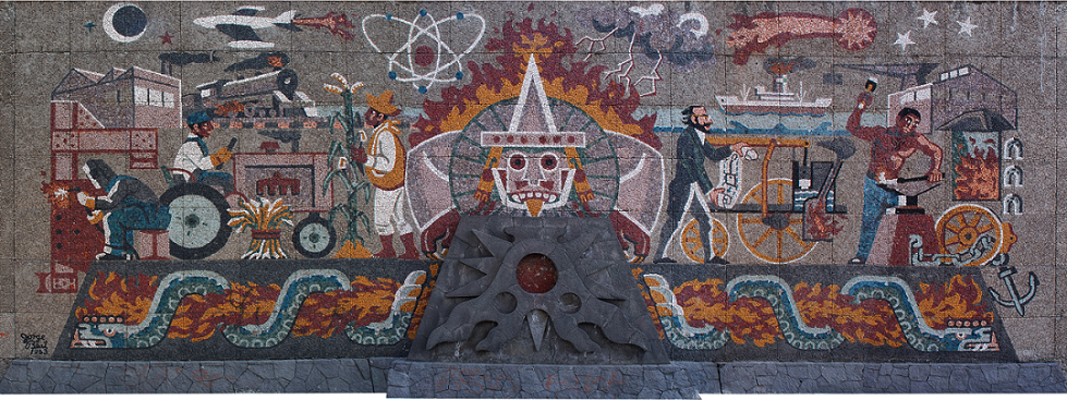 En este mural se muestra el aprovechamiento de los energéticos para el desarrollo de los transportes. En el extremo izquierdo, se observa a un maestro soldador hacer su trabajo en grandes vigas y paneles metálicos, un campesino maneja un tractor ayudando a su compañero a cosechar el maíz. En la parte superior aparecen, entre otras figuras, una locomotora de vapor, un avión de propulsión a chorro y el símbolo de la energía atómica con las partículas eléctricas orbitando el núcleo.