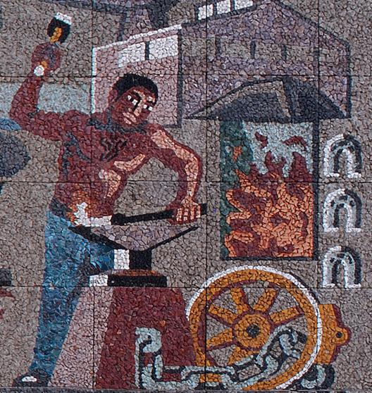 Por su parte, en el extremo derecho se ubica la imagen de un ingeniero con un plano en sus manos que alude a la invención de la máquina de vapor, que representa a la revolución industrial del siglo XIX. Junto, se encuentra un herrero transformando el metal para lo cual emplea el fuego. Encima se avista un barco de vapor y un cometa con su estela de luz.
