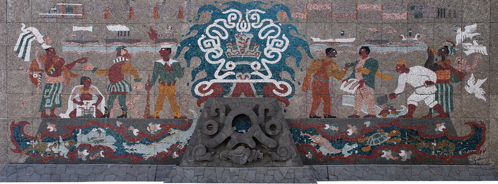Dos indígenas mayas enmarcan la escena general de este mural: el hombre -que carga un enorme pez- se conecta con la mujer, situada en el extremo derecho, mediante una corriente de agua que sale del caracol que toca ella. Sobre dicha corriente, se aprecian barcos diversos entre ellos un buque petrolero, un buque de guerra y un barco de pasajeros.
